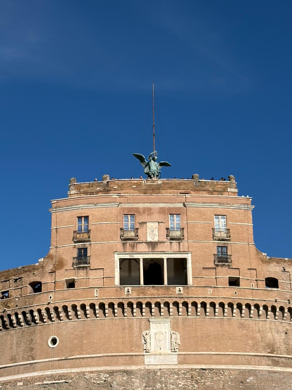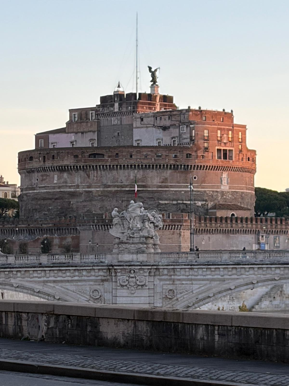 En remontant la via della Conciliazione, nous avons longé le Tibre jusqu'au Château Saint-Ange. Ancien mausolée de l'empereur Hadrien reconverti en forteresse pontificale, il domine le fleuve avec ses anges de pierre et son célèbre couloir secret — le Passetto — par lequel les papes fuyaient le Vatican en cas de danger.
