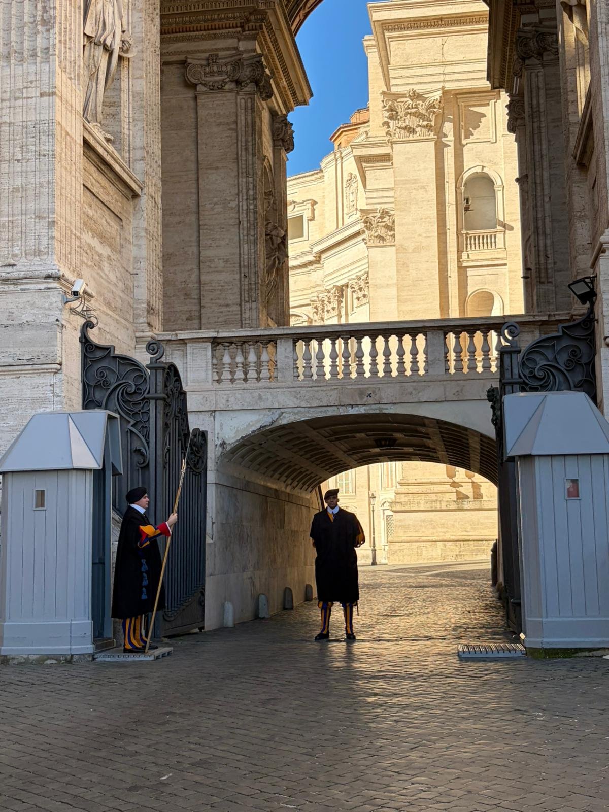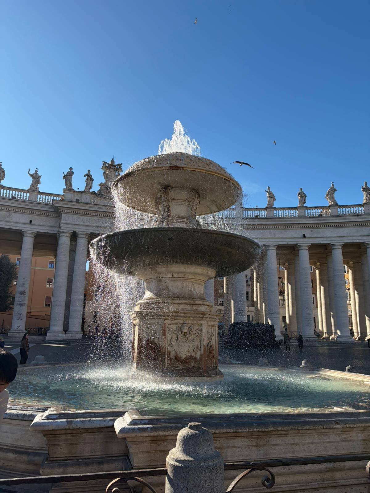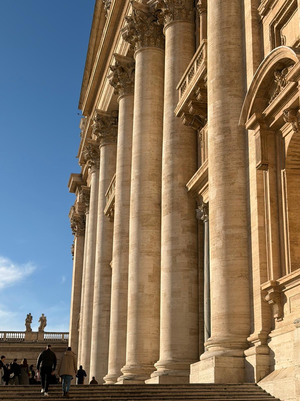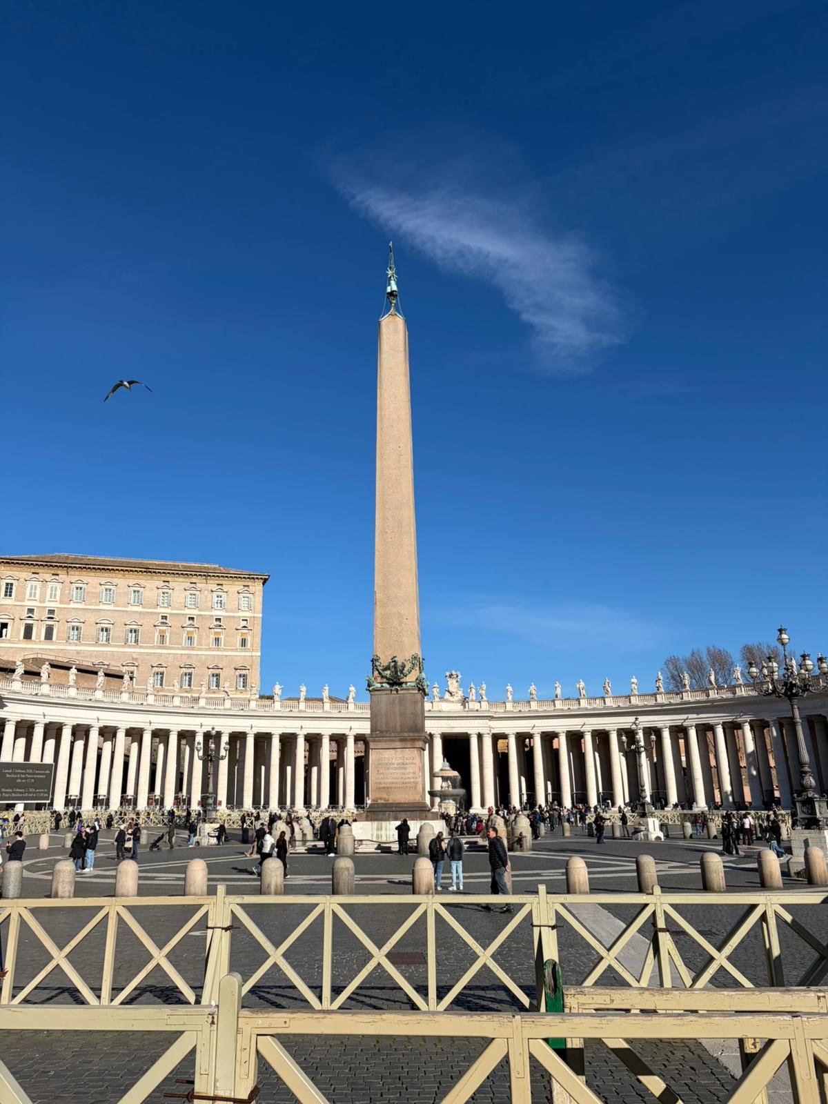 À peine arrivés, nous avons découvert la majestueuse Place Saint-Pierre dans la lumière matinale. Dessinée par le Bernin au XVIIe siècle, cette immense colonnade embrasse les fidèles du monde entier : deux rangées de colonnes qui, vues depuis le centre, forment un alignement parfait — une illusion d'optique voulue par l'architecte.
