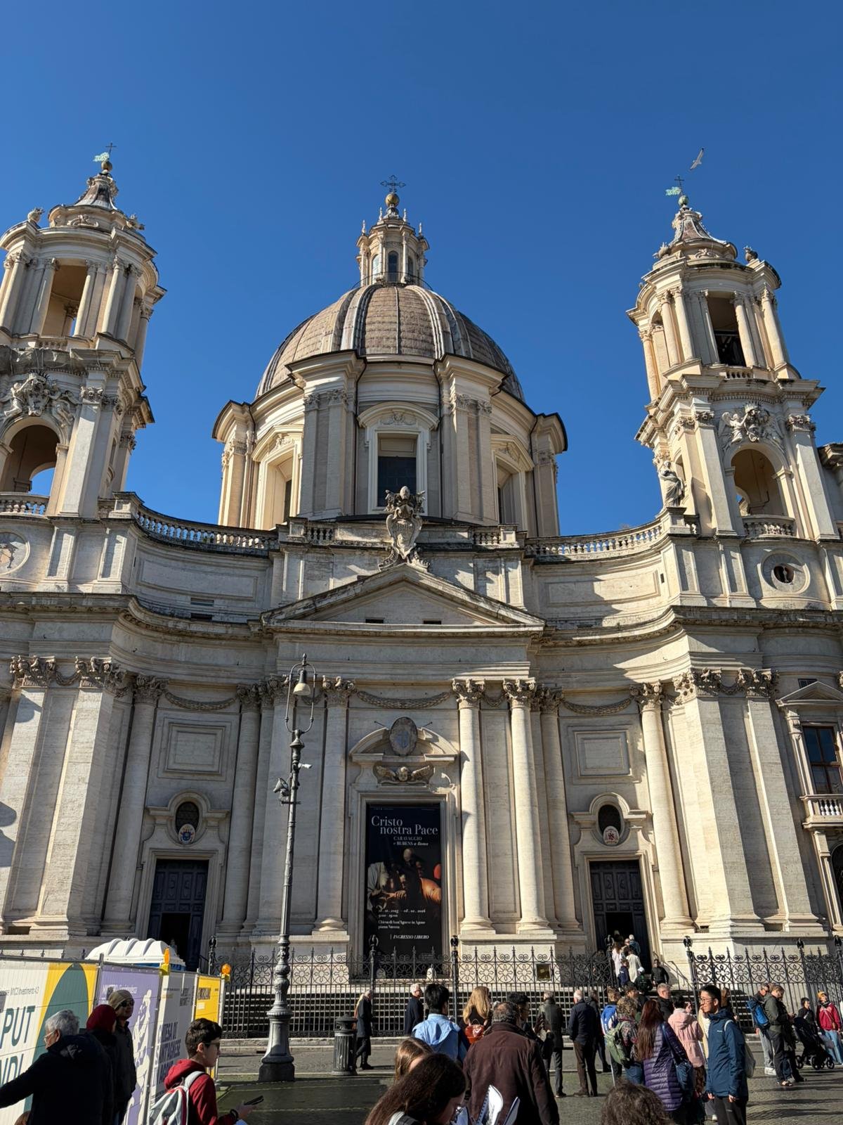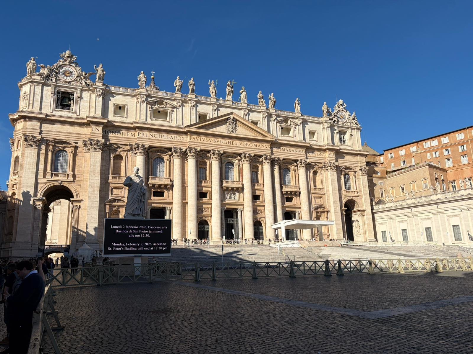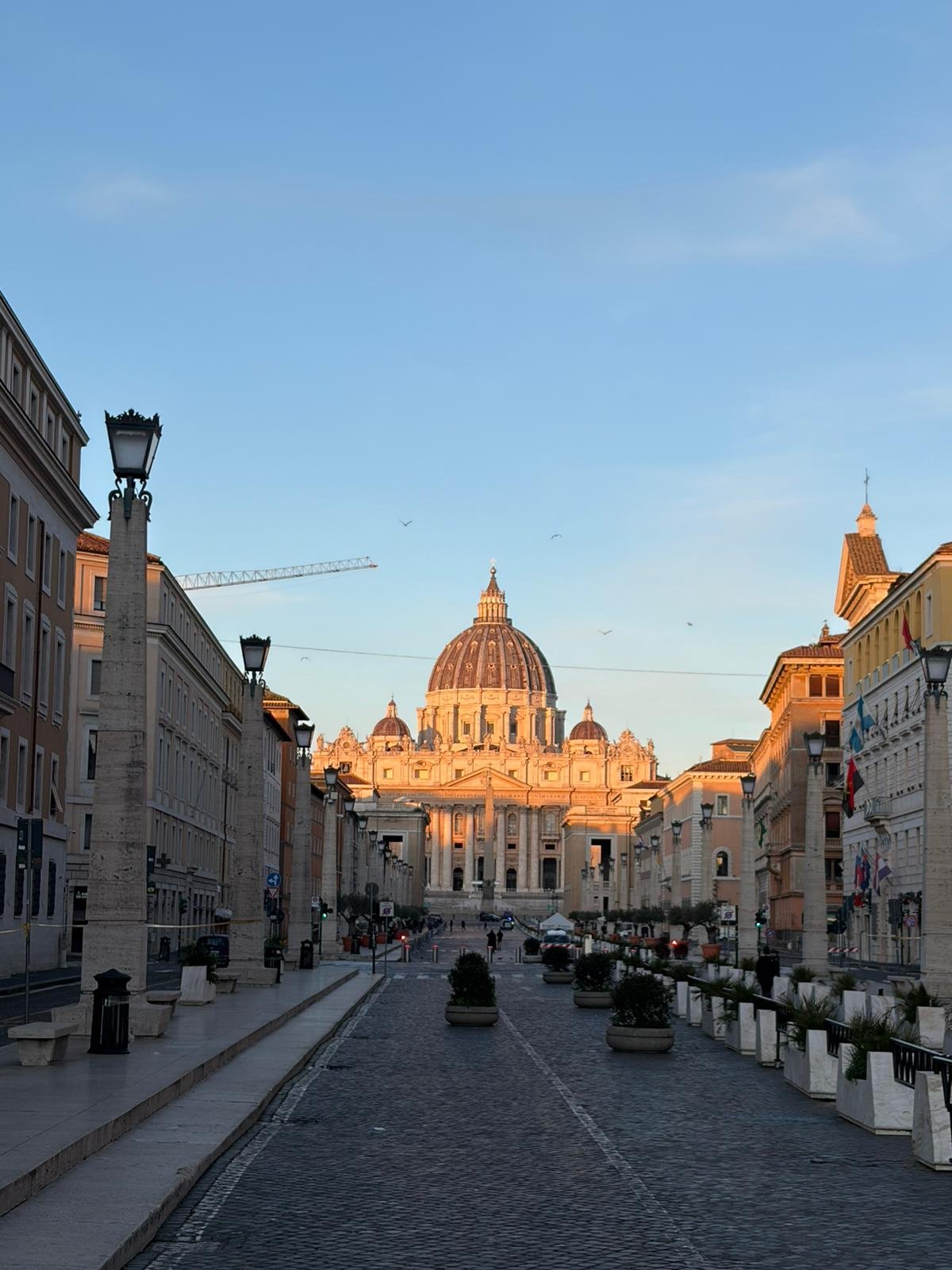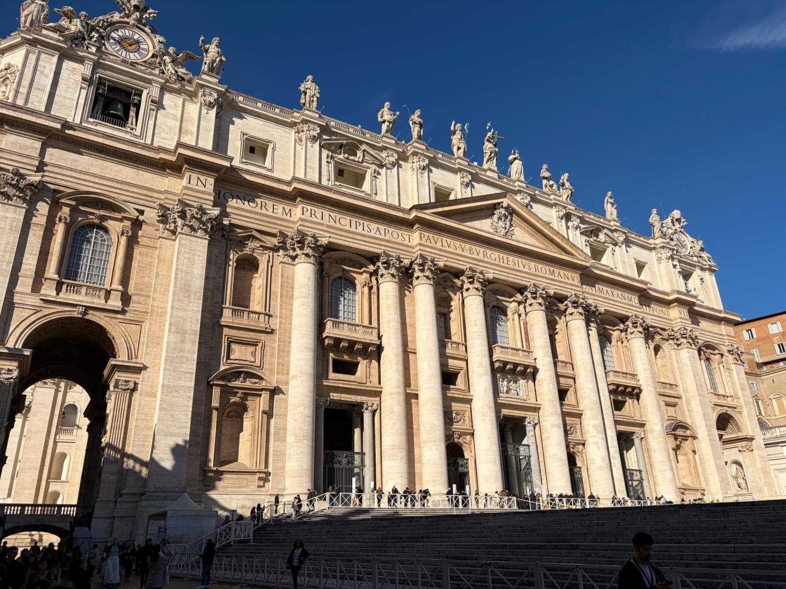 À peine arrivés, nous avons découvert la majestueuse Place Saint-Pierre dans la lumière matinale. Dessinée par le Bernin au XVIIe siècle, cette immense colonnade embrasse les fidèles du monde entier : deux rangées de colonnes qui, vues depuis le centre, forment un alignement parfait — une illusion d'optique voulue par l'architecte.