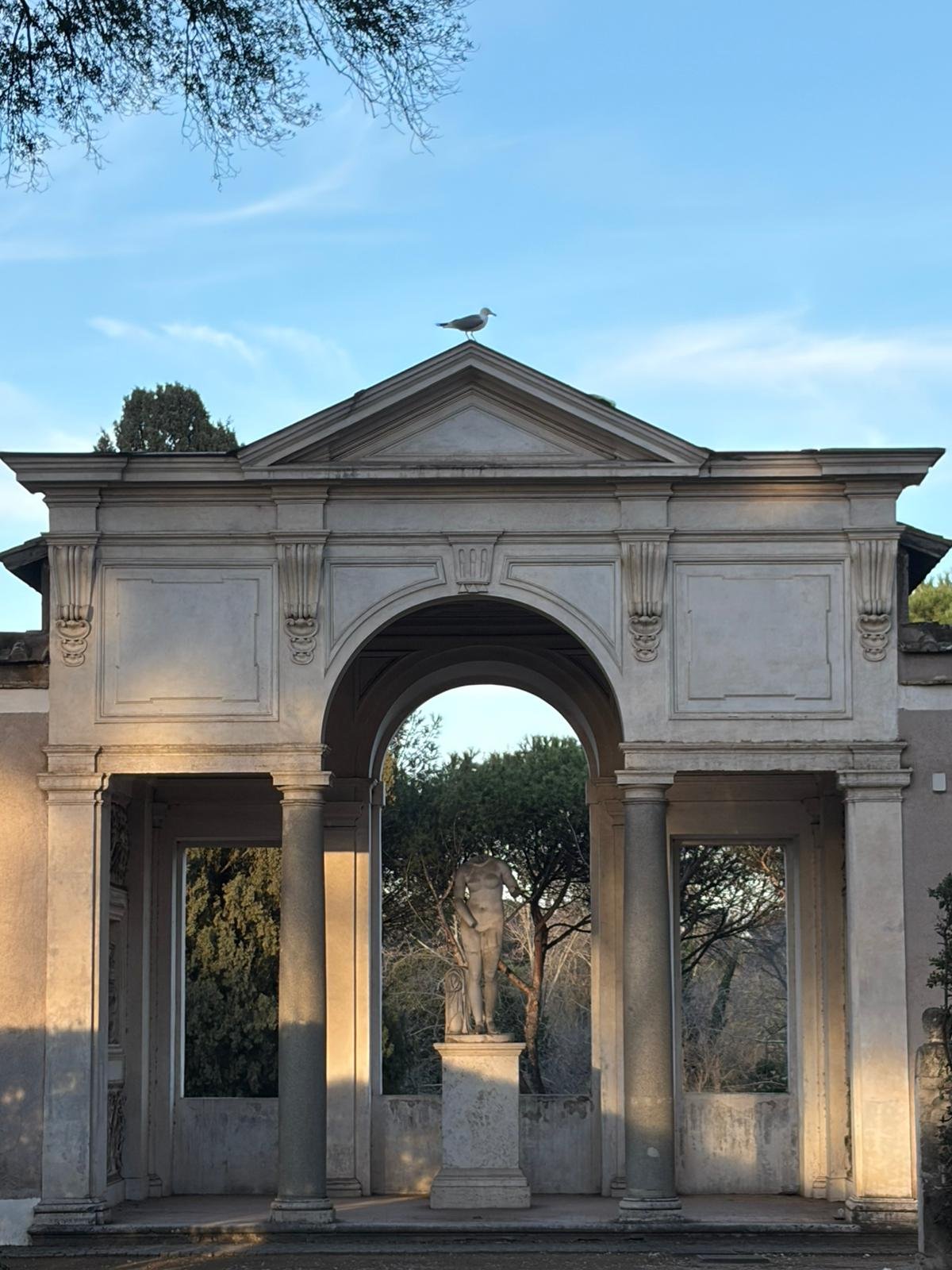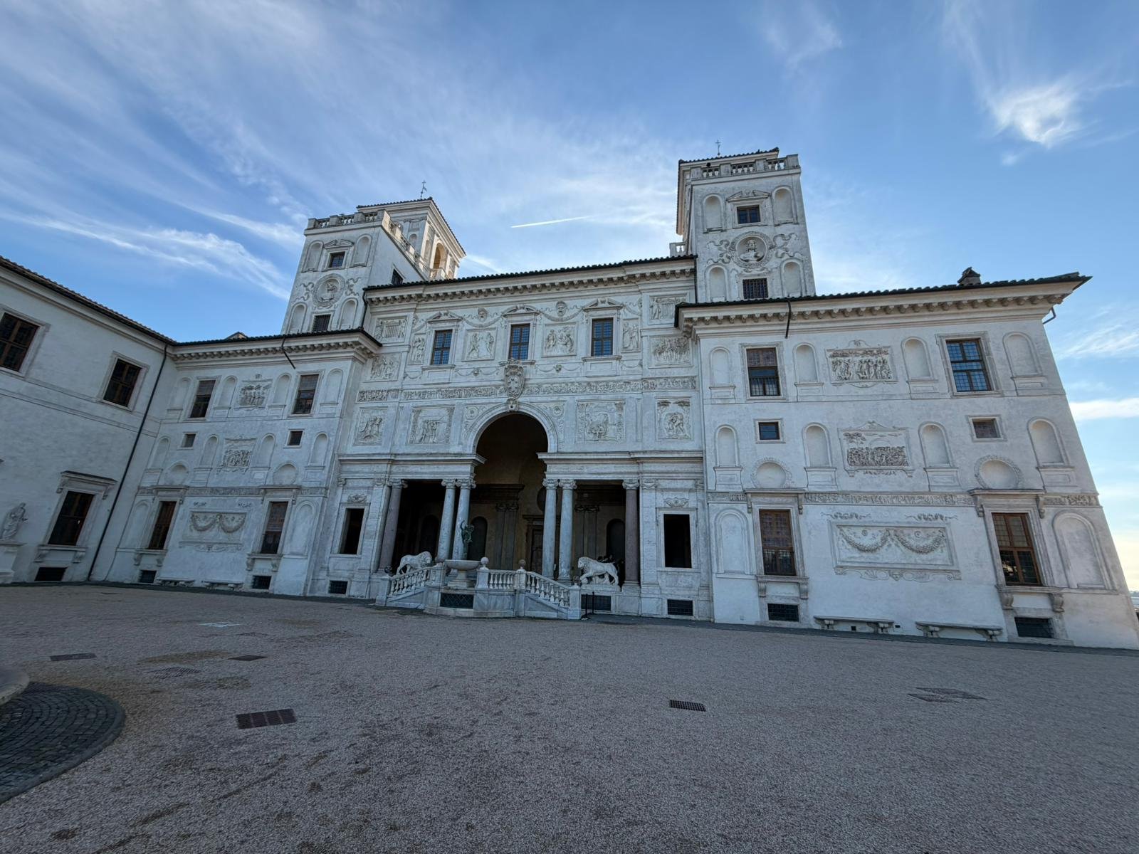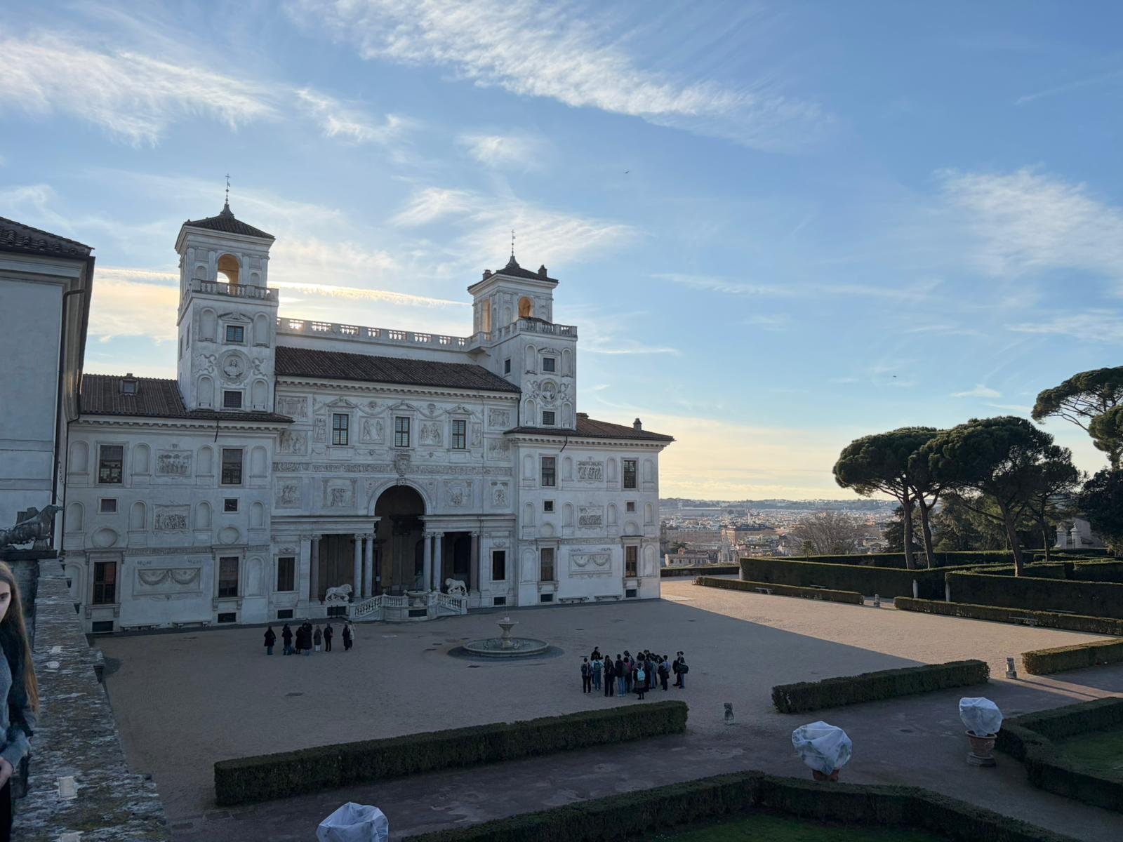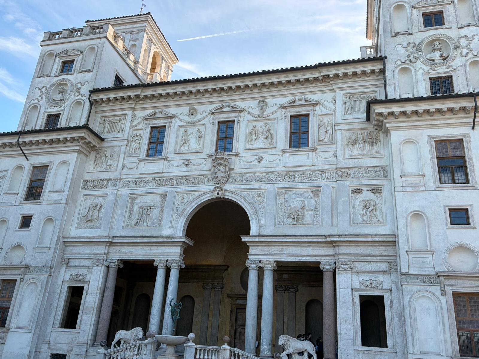 Notre guide nous a conduits à travers les jardins à la française plantés de cèdres centenaires, puis dans les salles décorées de moulages antiques. La façade intérieure, couverte de bas-reliefs enchâssés dans le crépi, est l'une des plus étranges et belles surfaces architecturales de Rome.