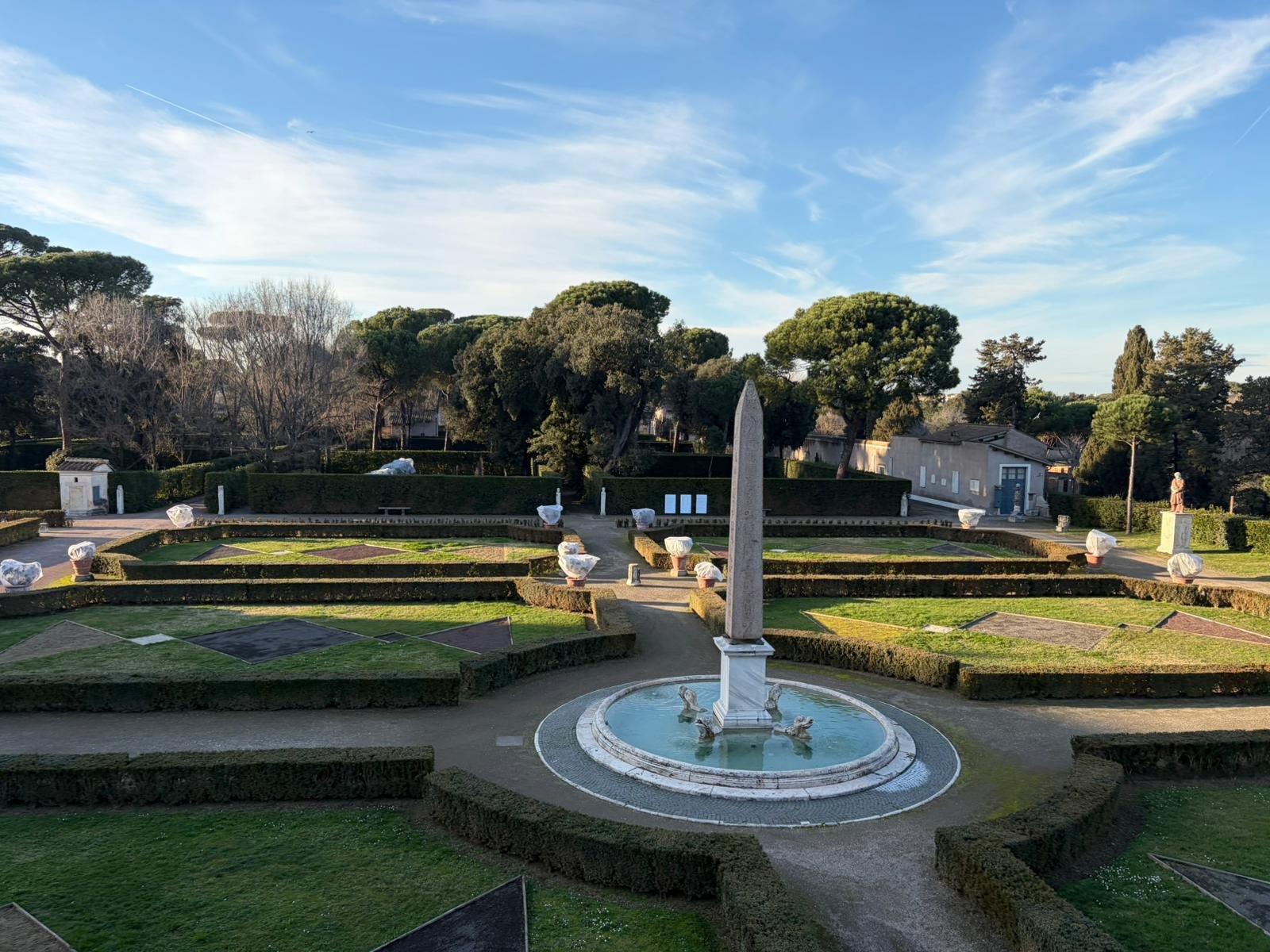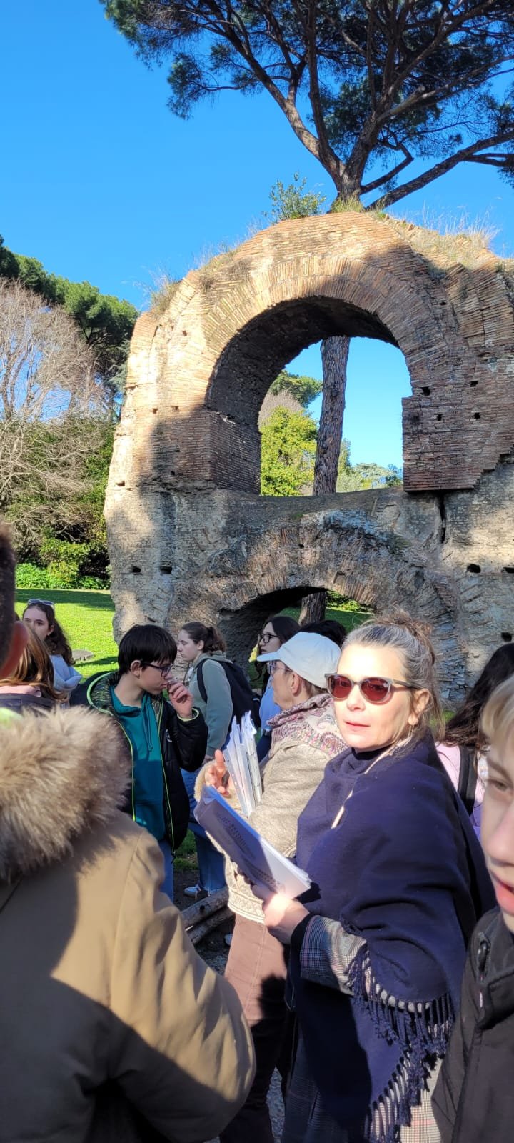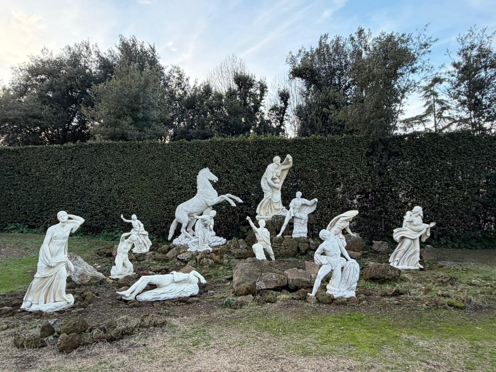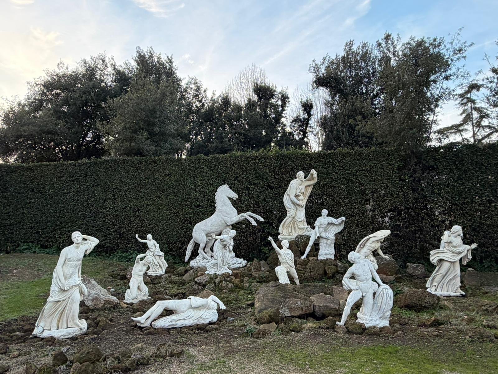 Notre guide nous a conduits à travers les jardins à la française plantés de cèdres centenaires, puis dans les salles décorées de moulages antiques. La façade intérieure, couverte de bas-reliefs enchâssés dans le crépi, est l'une des plus étranges et belles surfaces architecturales de Rome.