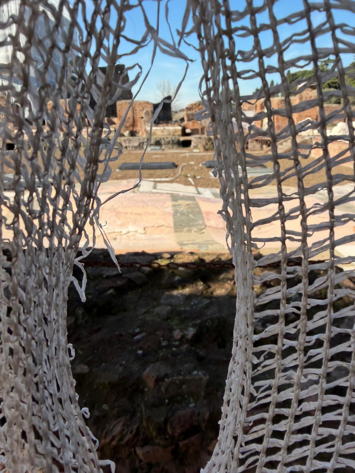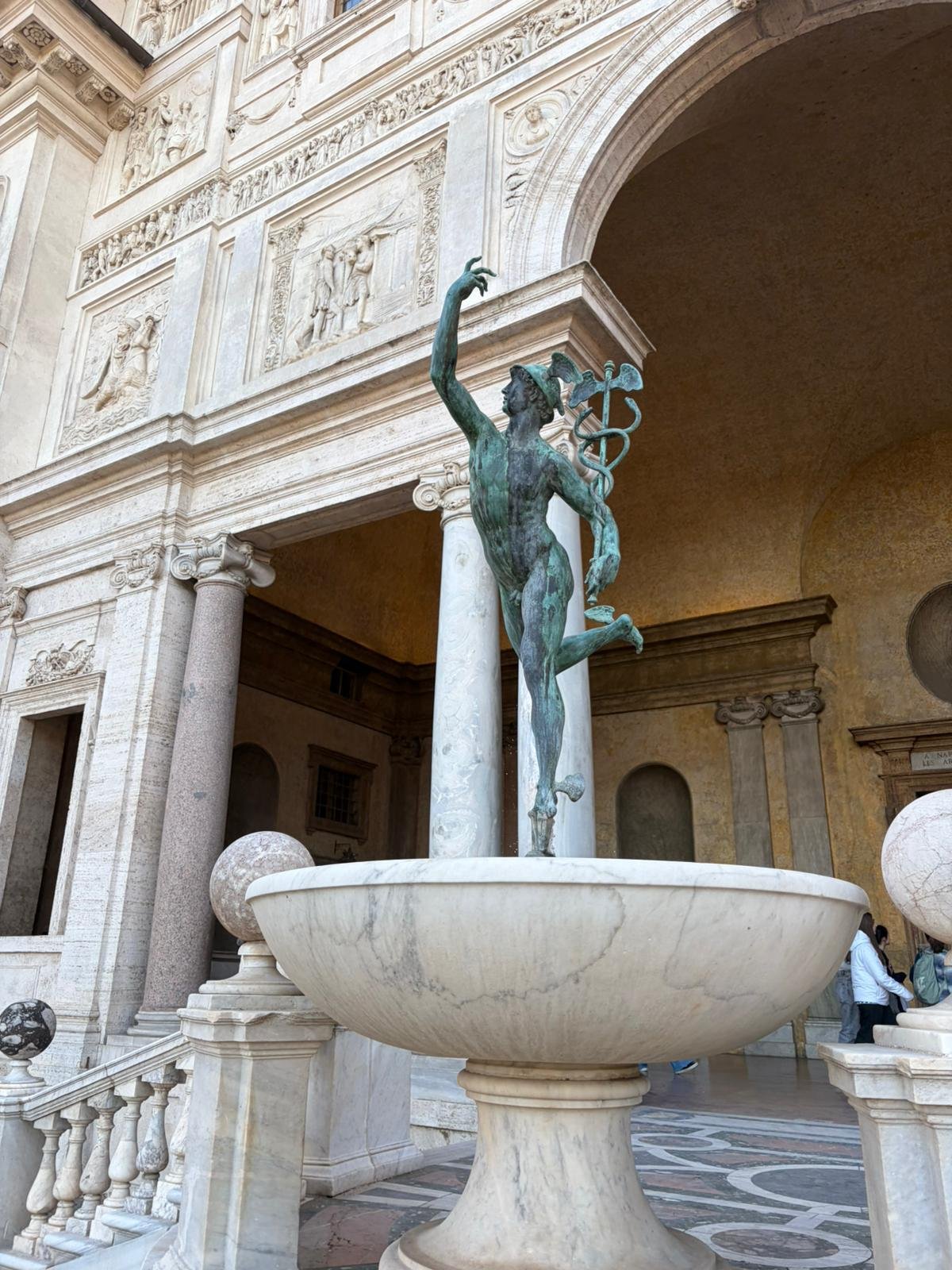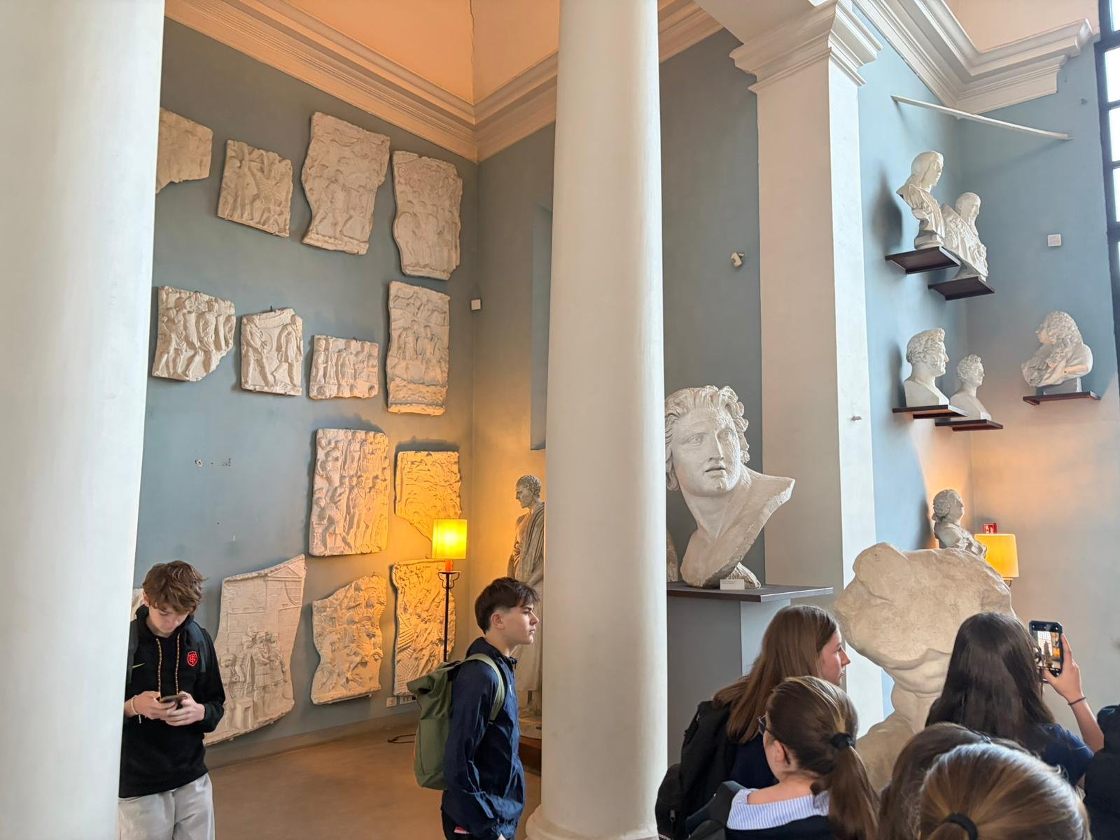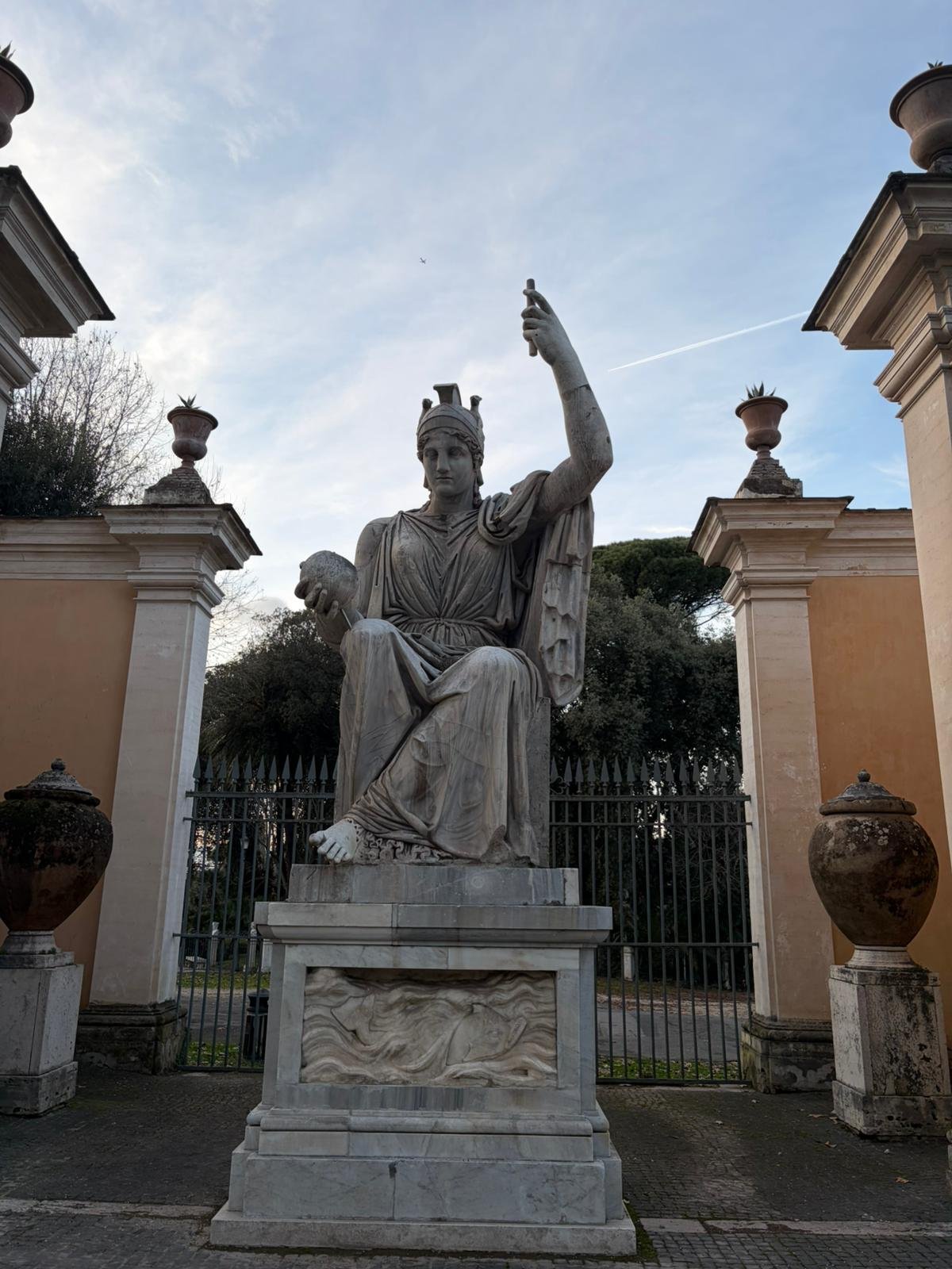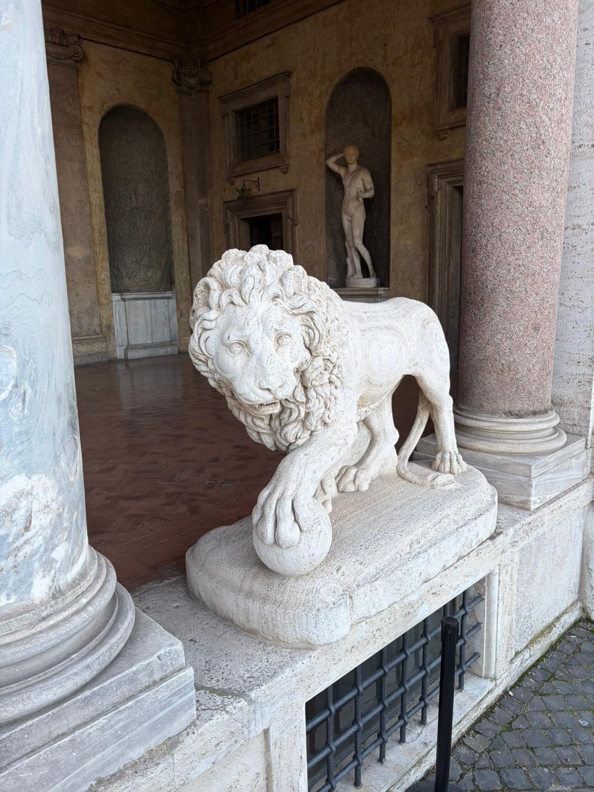 Notre guide nous a conduits à travers les jardins à la française plantés de cèdres centenaires, puis dans les salles décorées de moulages antiques. La façade intérieure, couverte de bas-reliefs enchâssés dans le crépi, est l'une des plus étranges et belles surfaces architecturales de Rome.