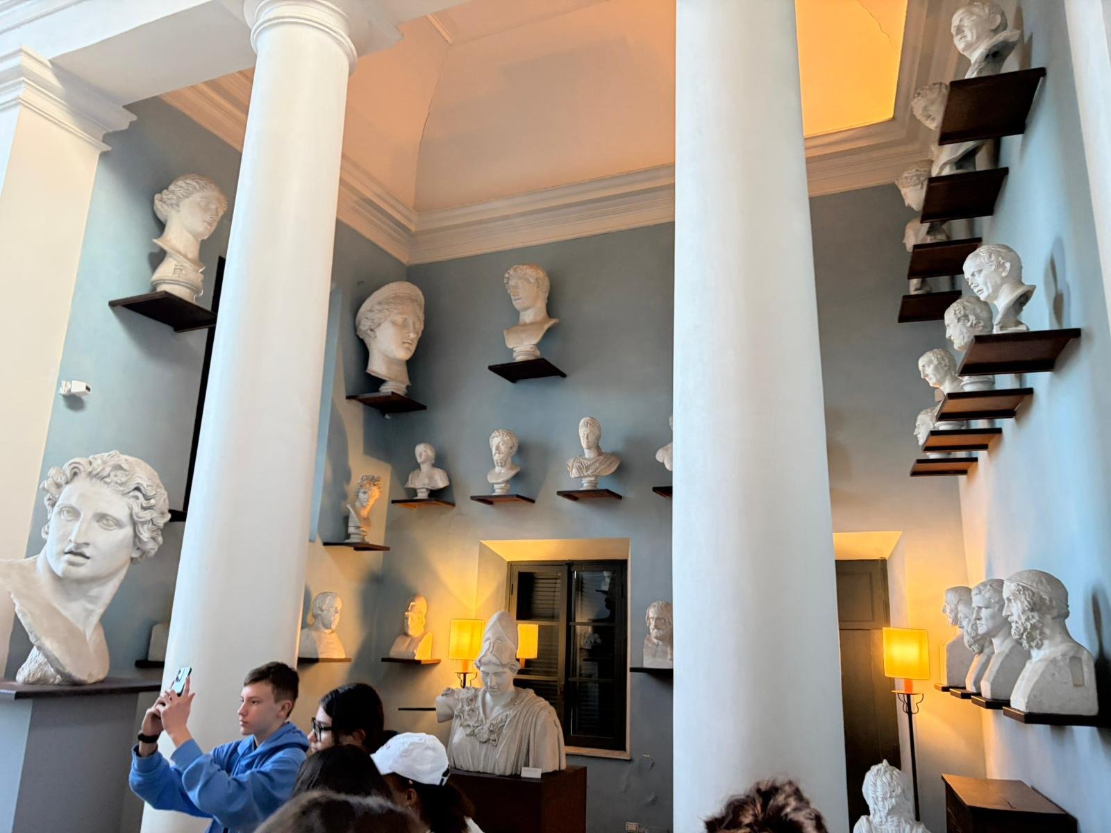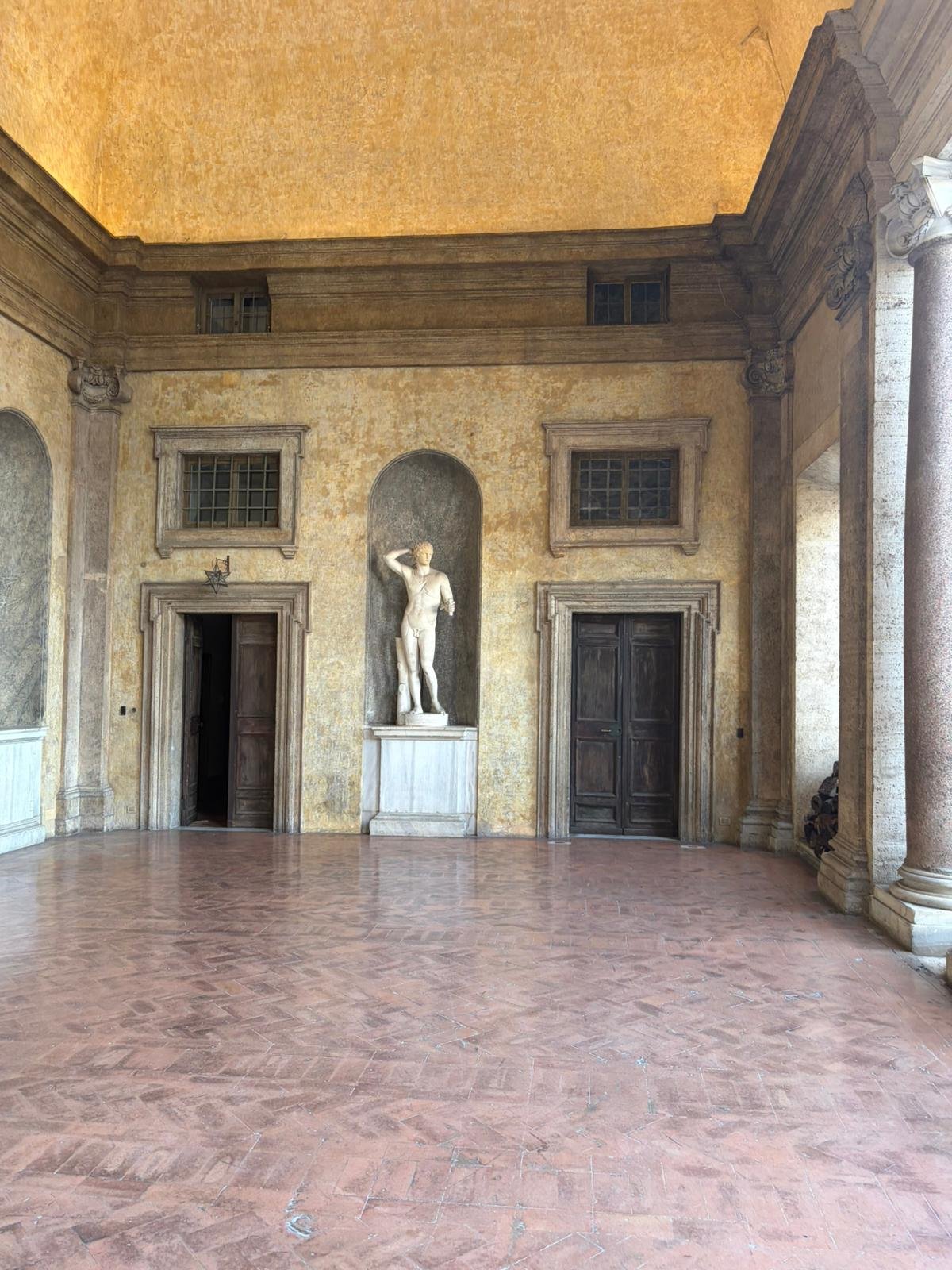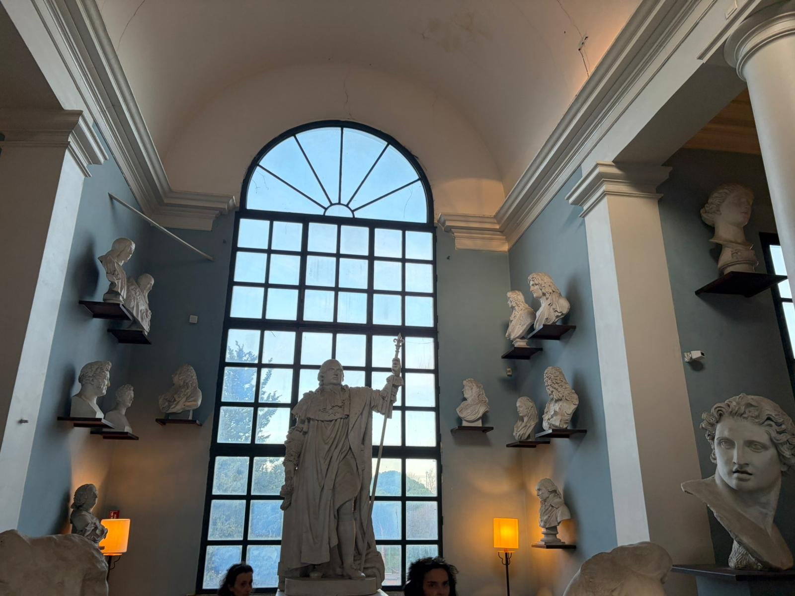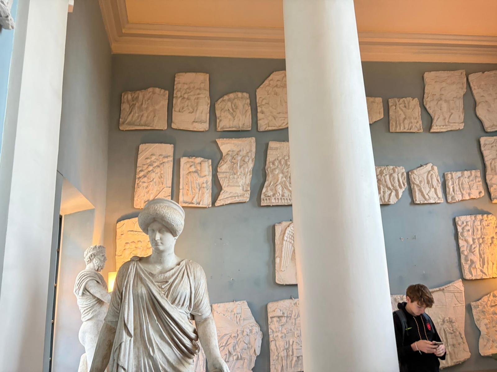 Notre guide nous a conduits à travers les jardins à la française plantés de cèdres centenaires, puis dans les salles décorées de moulages antiques. La façade intérieure, couverte de bas-reliefs enchâssés dans le crépi, est l'une des plus étranges et belles surfaces architecturales de Rome.
