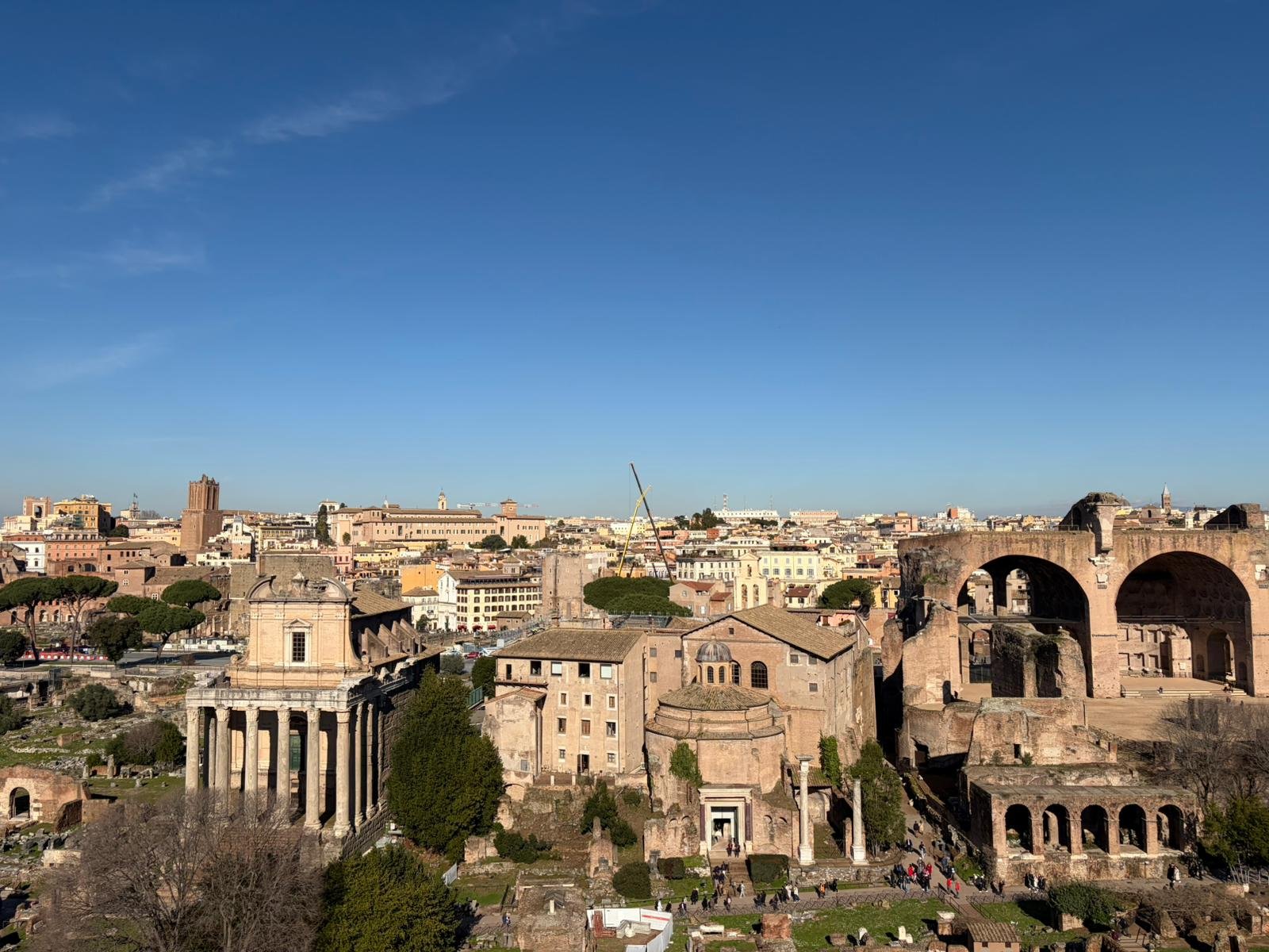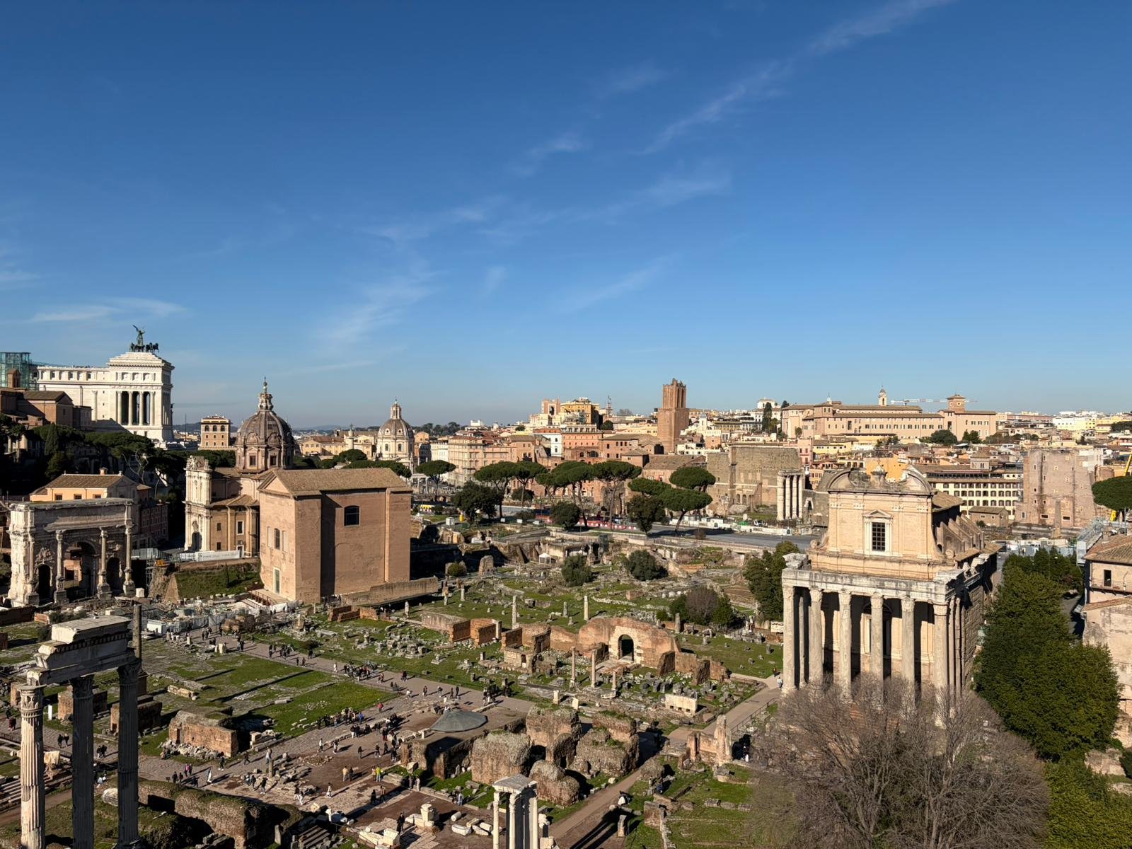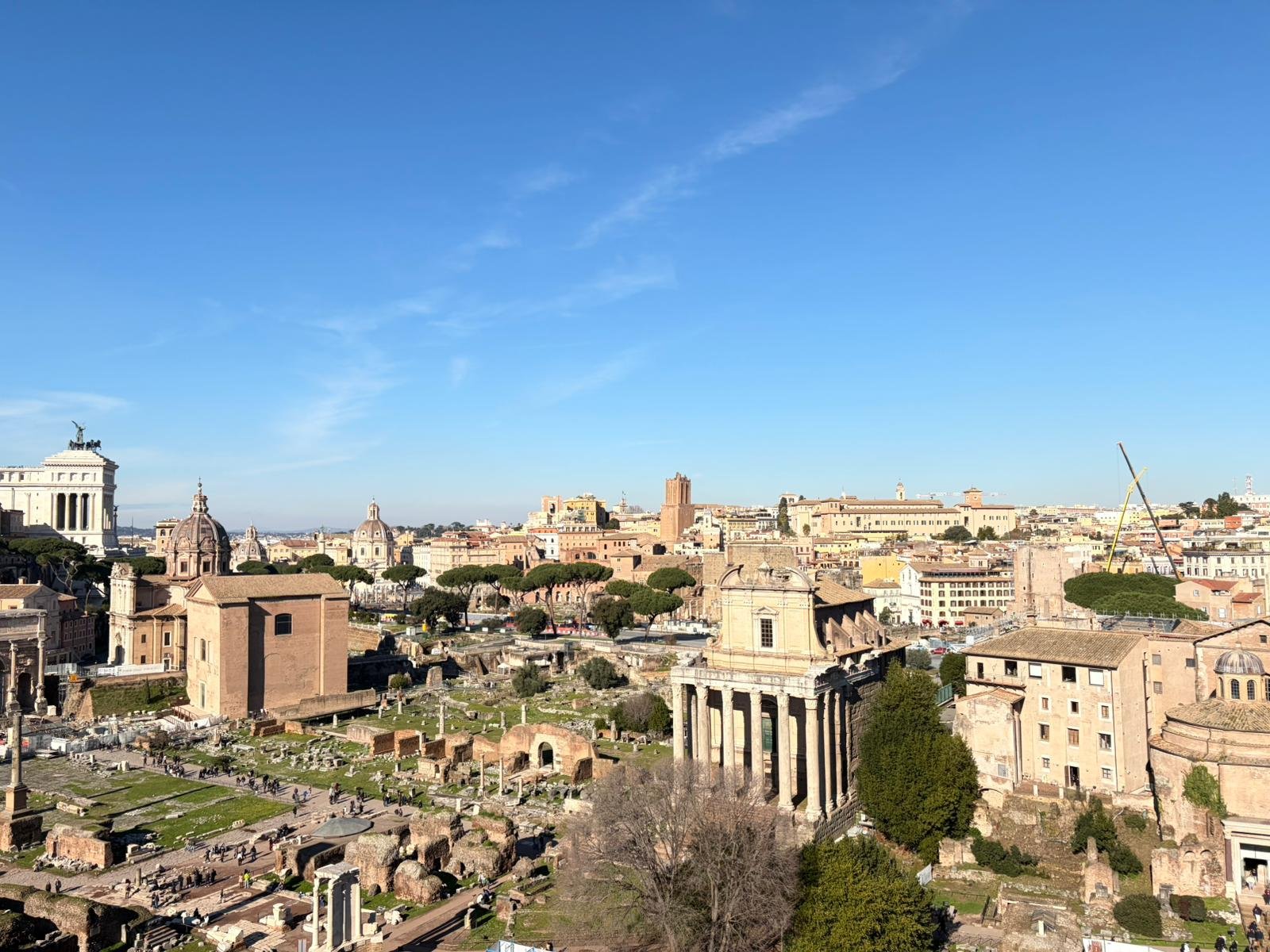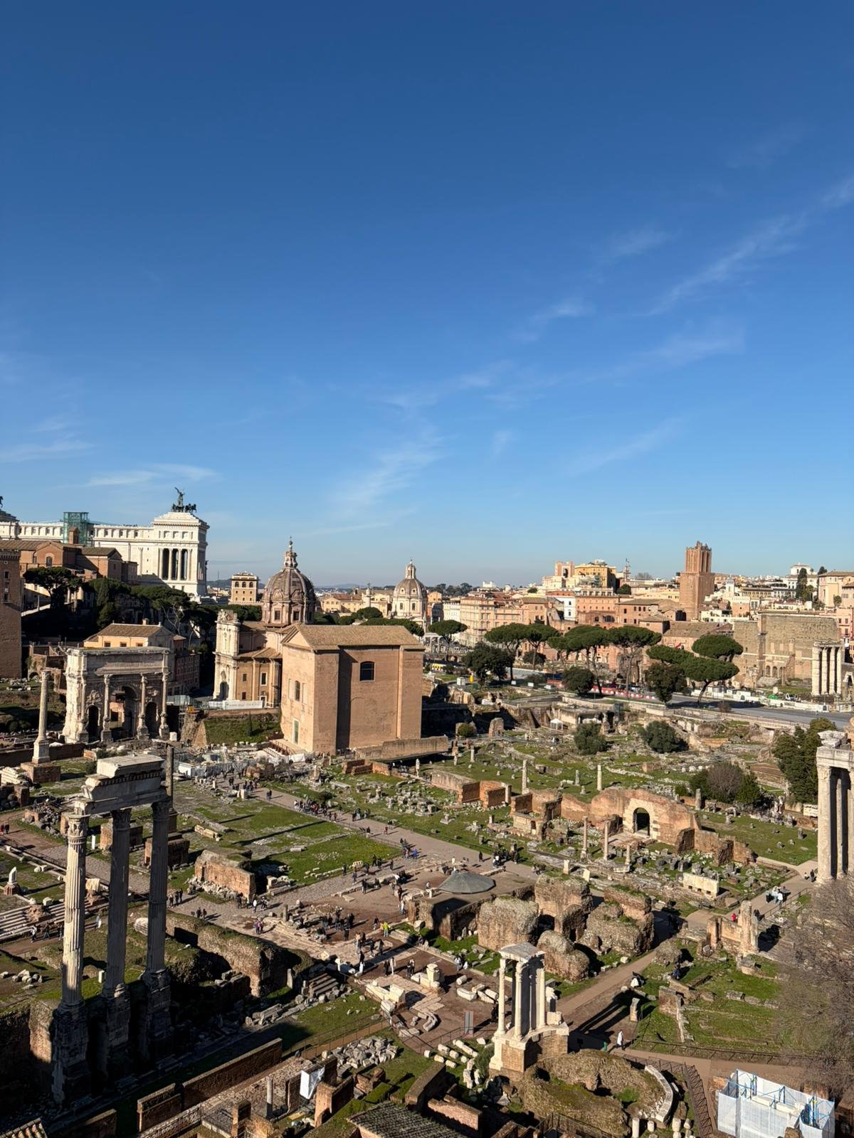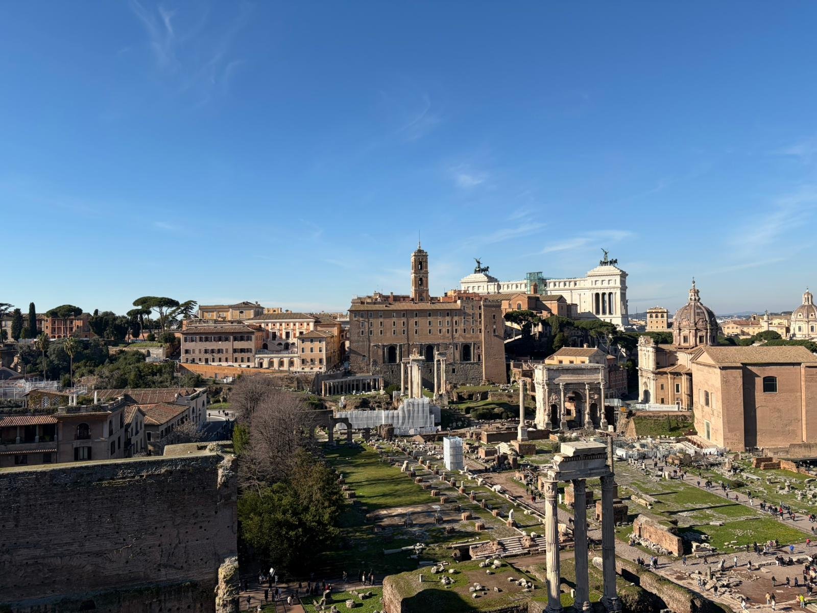 À quelques mètres, le Forum Romain s'étend comme une carte postale de l'Antiquité : les colonnes du temple de Saturne, l'arc de Titus, la tribune des Rostrums depuis laquelle Cicéron prononçait ses discours. C'est ici que Rome a inventé la politique, le droit et l'urbanisme.
