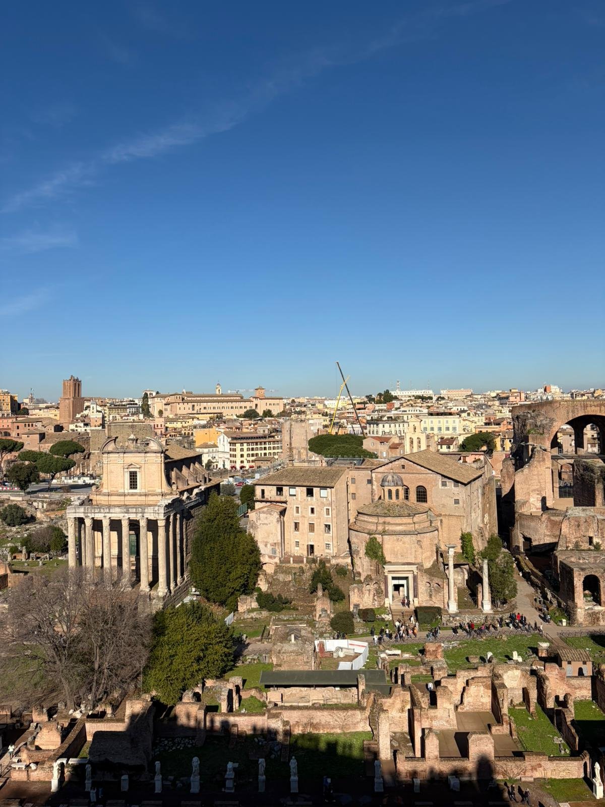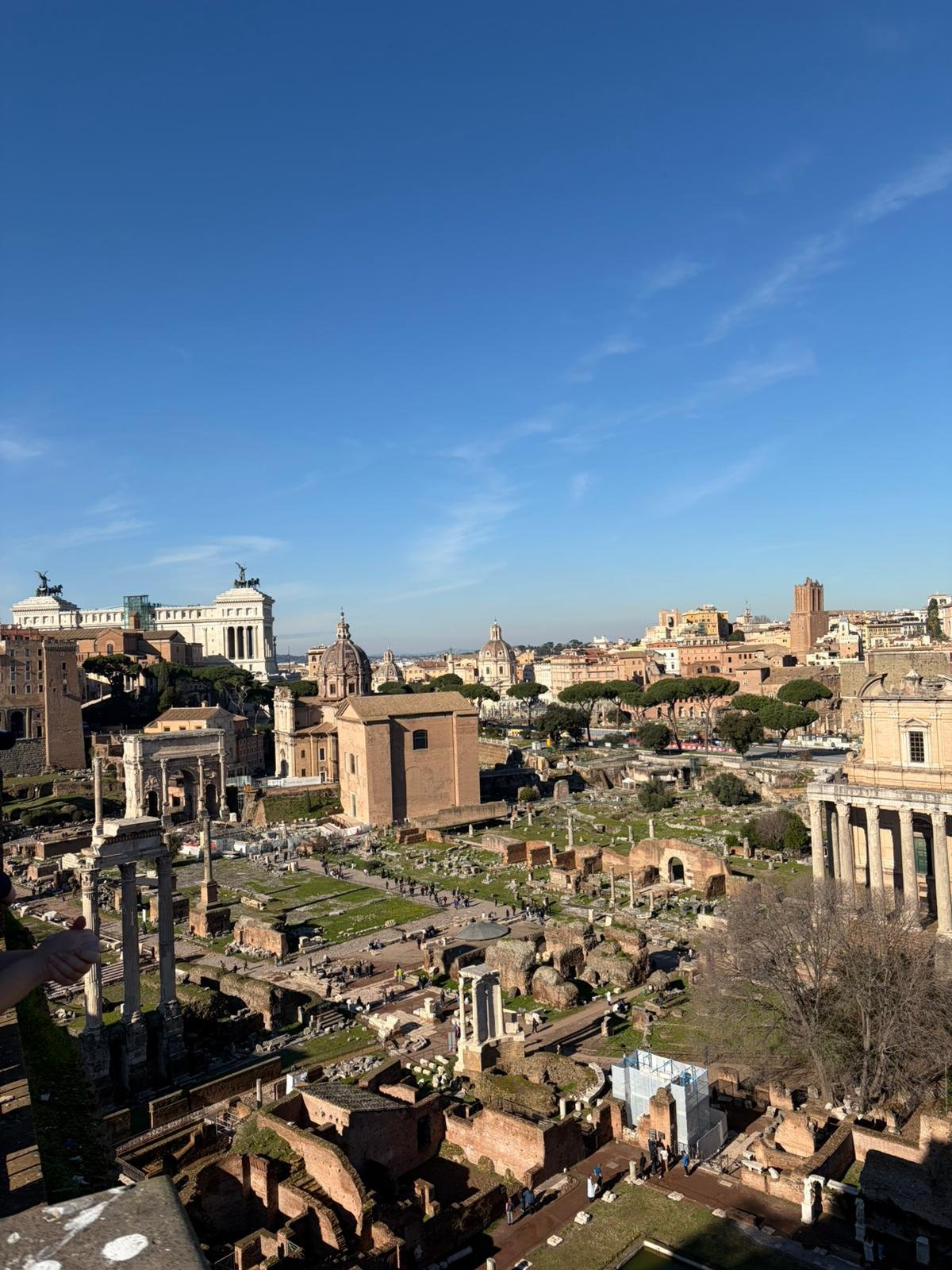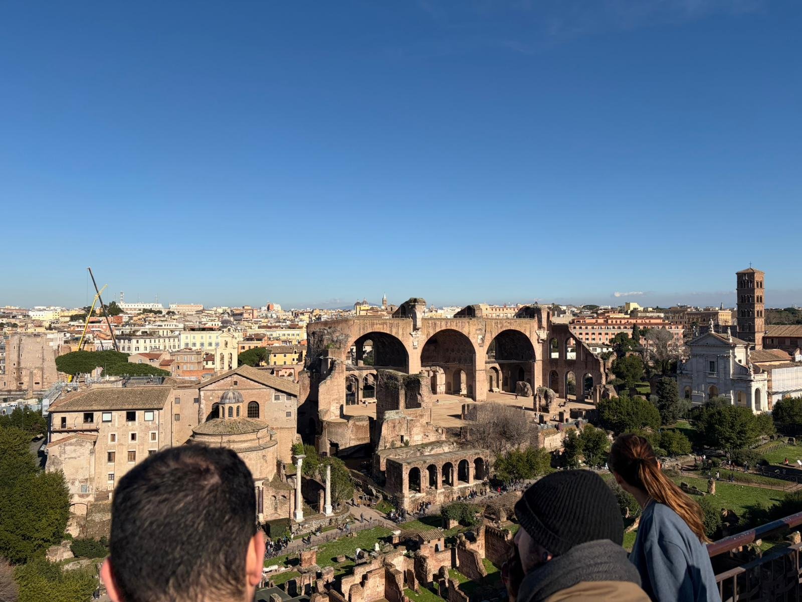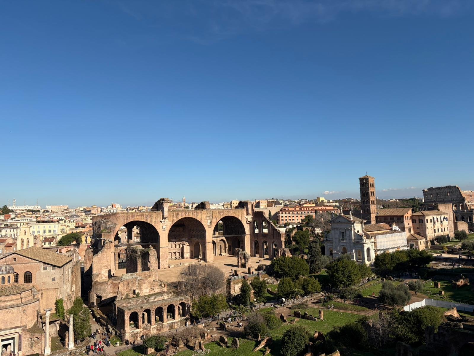 À quelques mètres, le Forum Romain s'étend comme une carte postale de l'Antiquité : les colonnes du temple de Saturne, l'arc de Titus, la tribune des Rostrums depuis laquelle Cicéron prononçait ses discours. C'est ici que Rome a inventé la politique, le droit et l'urbanisme.
