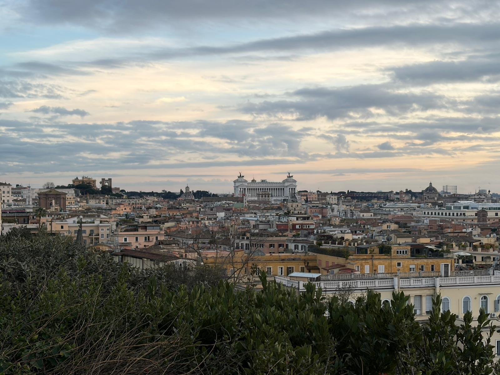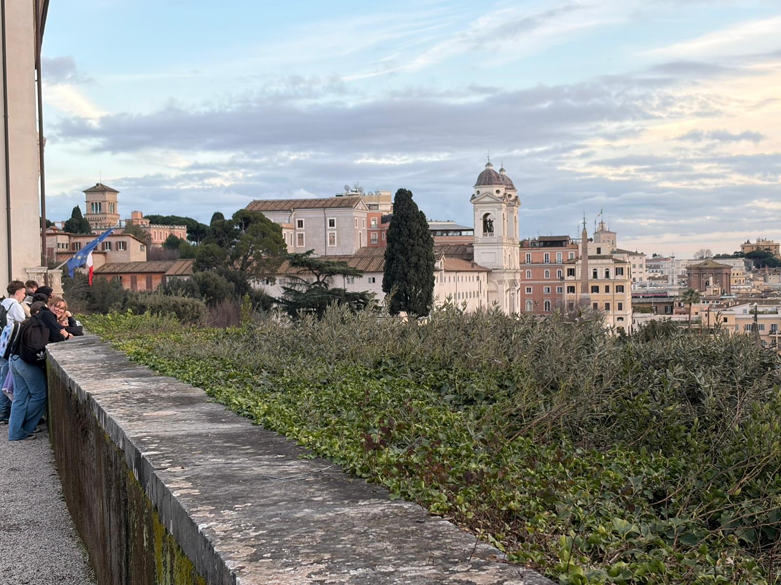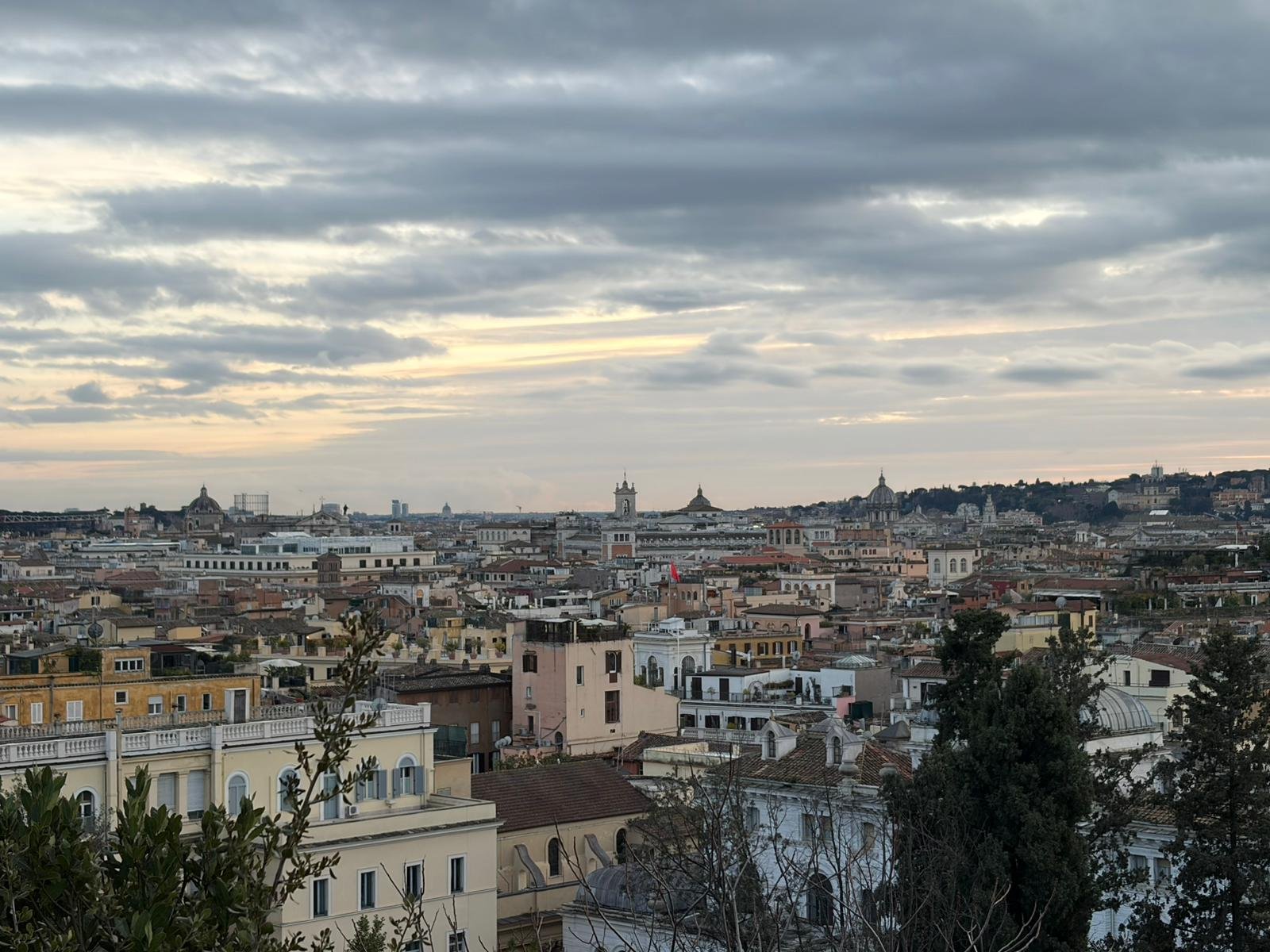 Du haut de la terrasse, la vue sur les toits de Rome — dômes, clochers, terrasses fleuries — offre l'un des panoramas les plus mémorables de la ville. On distingue le dôme de Saint-Pierre, le Panthéon, le Vittoriano blanc : toute l'histoire en un seul regard.